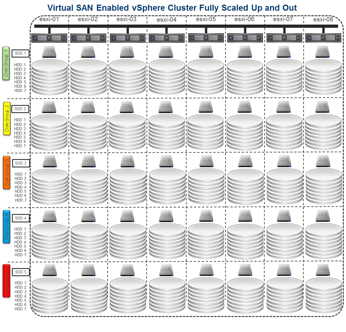 In a previous post here I detailed the Scale Up and Scale Out capabilities of VSAN. It looks like I’ll need to redo my diagrams since Virtual SAN just increased the number of HDDs in a disk group from 6 to 7. That’s a 17% increase in RAW capacity. The number of SSD’s remain 1 per disk group, 5 per host, 40 per 8 host cluster. With the increase from 6 to 7 HDD’s per disk group you can now have 35 HDD’s per host and in an 8 host cluster an increase from 240 to 280 HDD’s. That’s an extra 40 HDD’s which translates to a ton of extra RAW capacity.