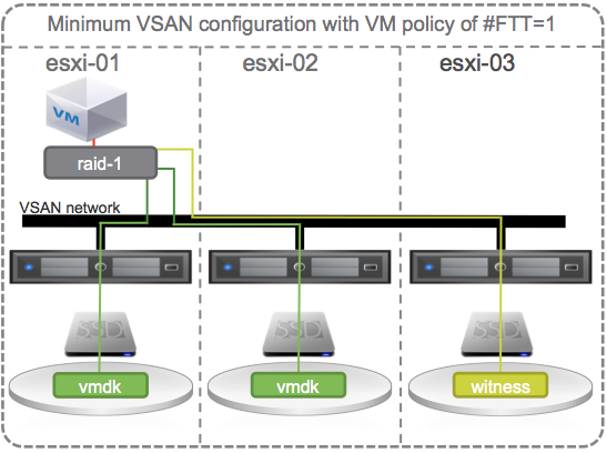 Lets start with the smallest VSAN configuration possible that provides redundancy, a 3 host vSphere cluster with VSAN enabled and 1 SSD and 1 HDD per host.  And, lets start with a single VM with the default # Failures To Tolerate (#FTT) equal to 1.  A VM has at least 3 objects (namespace, swap, vmdk).  Each object has 3 components (data 1, data 2, witness) to satisfy #FTT=1.  Lets just focus on the vmdk object and say that the VM sits on host 1 with copies of its vmdk data on host 1 and 2 and the witness on host 3.
