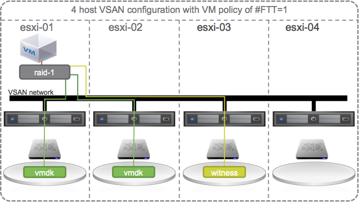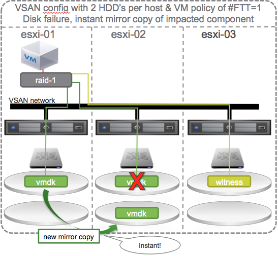 Then rather than waiting to replace the failed disk on esxi-02, VSAN could use the hard disk drive on esxi-04 to instantly recreate the new mirror copy.