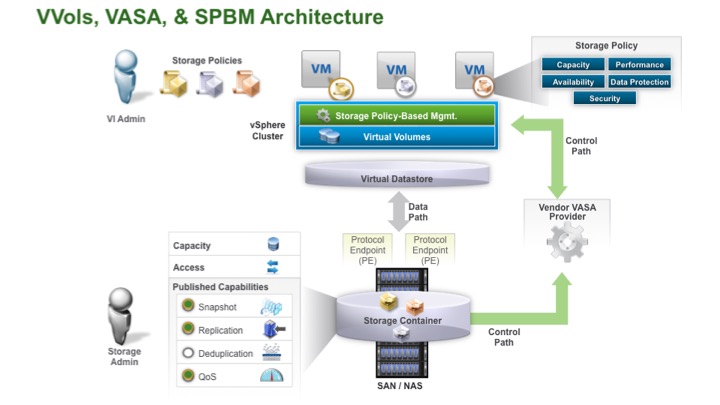 - VASA – vSphere API’s for Storage Awareness. Each storage device requires a VASA/VVol provider to advertise the capability of the Storage Containers to vCenter and vSphere and to create VVols.