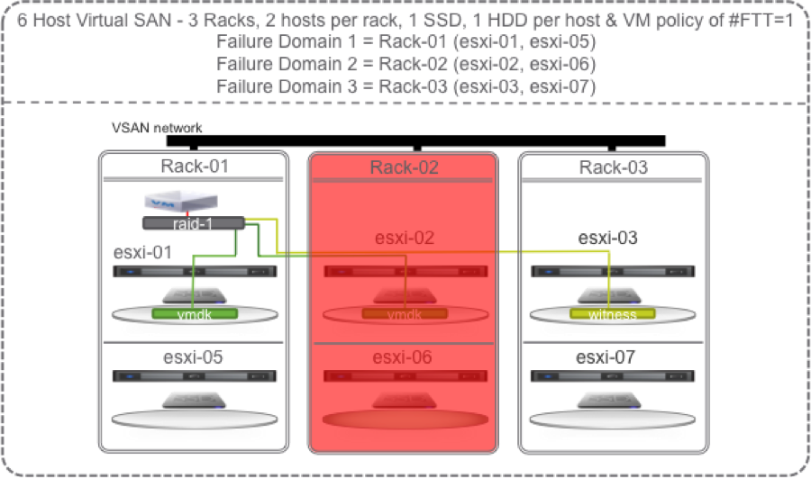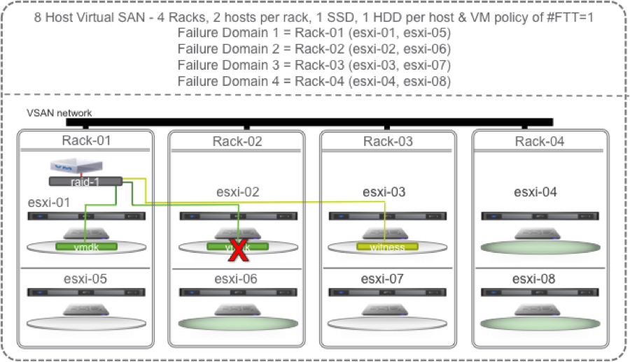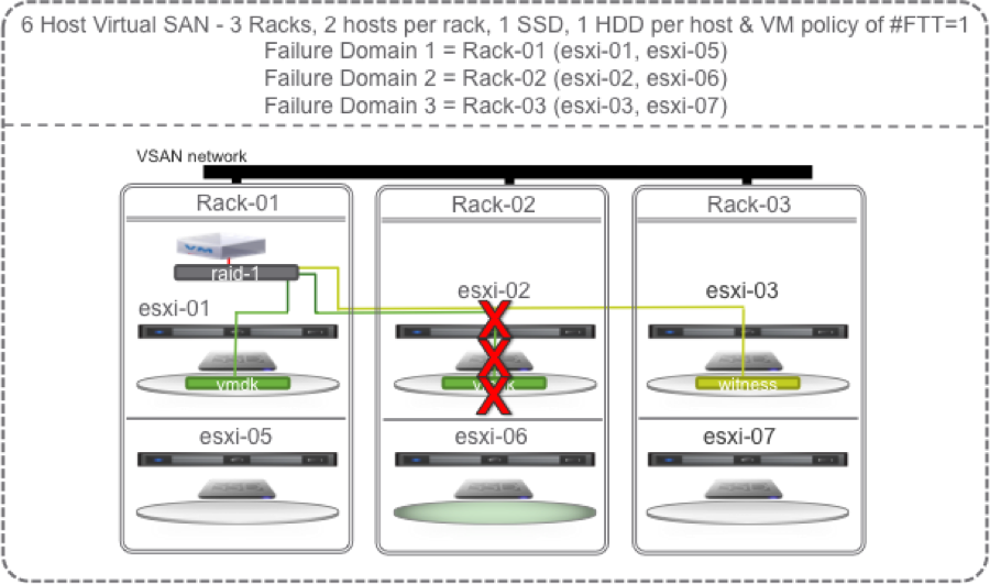 No problem, we still have access to the data on host 1 and the witness on host 3 so the VM can continue operation. But, Virtual SAN cannot self heal until at least 1 host in Rack-02 is restored to operation or replaced.