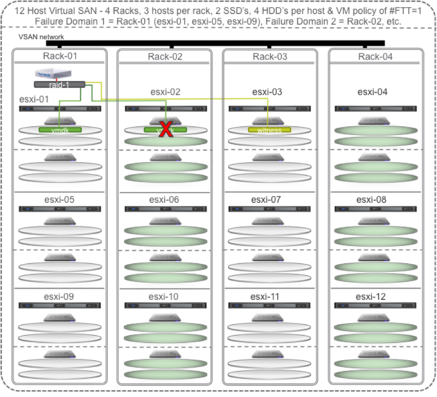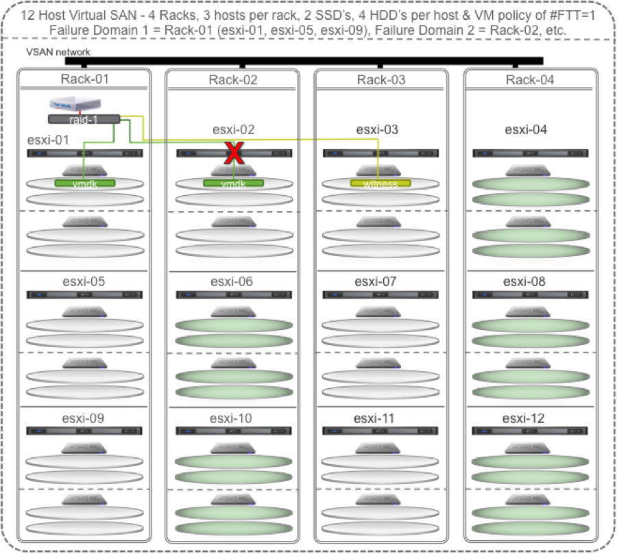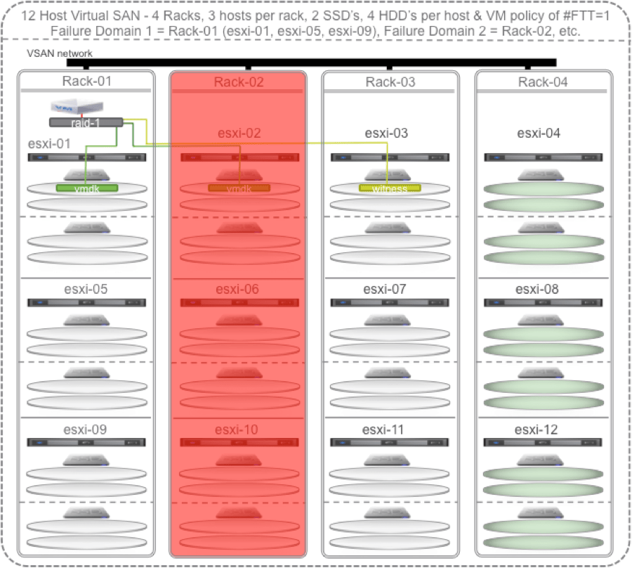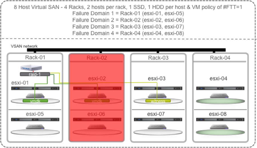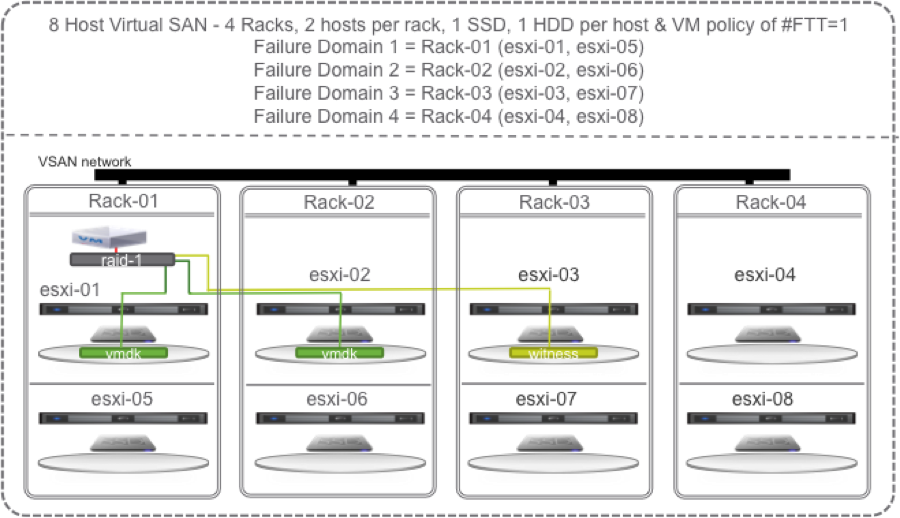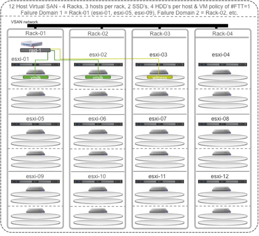 To maximize Virtual SAN’s self healing capabilities with policy set to # Failures To Tolerate equal 1 you could configure at least 4 racks, at least 2 hosts per rack, and at least 2 SSD and 4 HDD per host. In the diagrams to follow I happened to go with 3 hosts per rack.