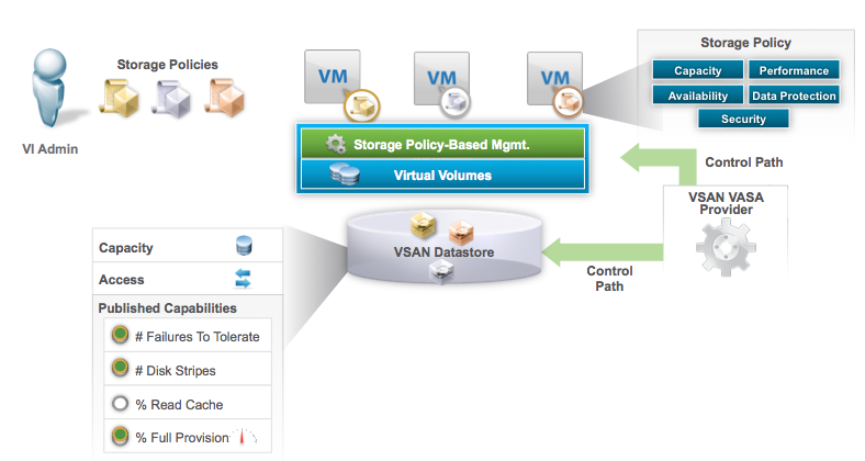 - VSAN is fully integrated into VMware Storage Policy Based Management (SPBM), VASA, and VVOLs. When that check box is clicked, the VSAN datastore is created and it’s VASA provider is registered with vCenter to expose it’s capabilities to SPBM. This allows different policy to be created so the same pool of capacity can deliver different service levels to different VM’s based on performance, availability, and protection. When VM’s are attached to a policy service level, their VM objects get created on the VSAN datastore in the form of Virtual Volume (VVOL) objects. VSAN further breaks these VVOL objects up into components to deliver on the defined protection and performance service levels.