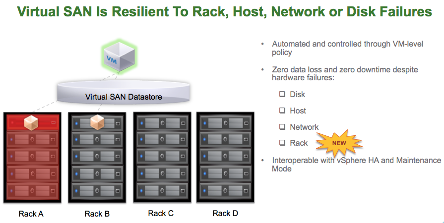 - VSAN now supports a feature called “Rack Diversity”. I wrote about the benefits here. This brings Software Defined Self Healing with Failure Domains. Hosts in the same rack can be placed into the same fault domain so that if an entire rack is lost then data remains available since another replica copy of the data resides on another host in another rack.