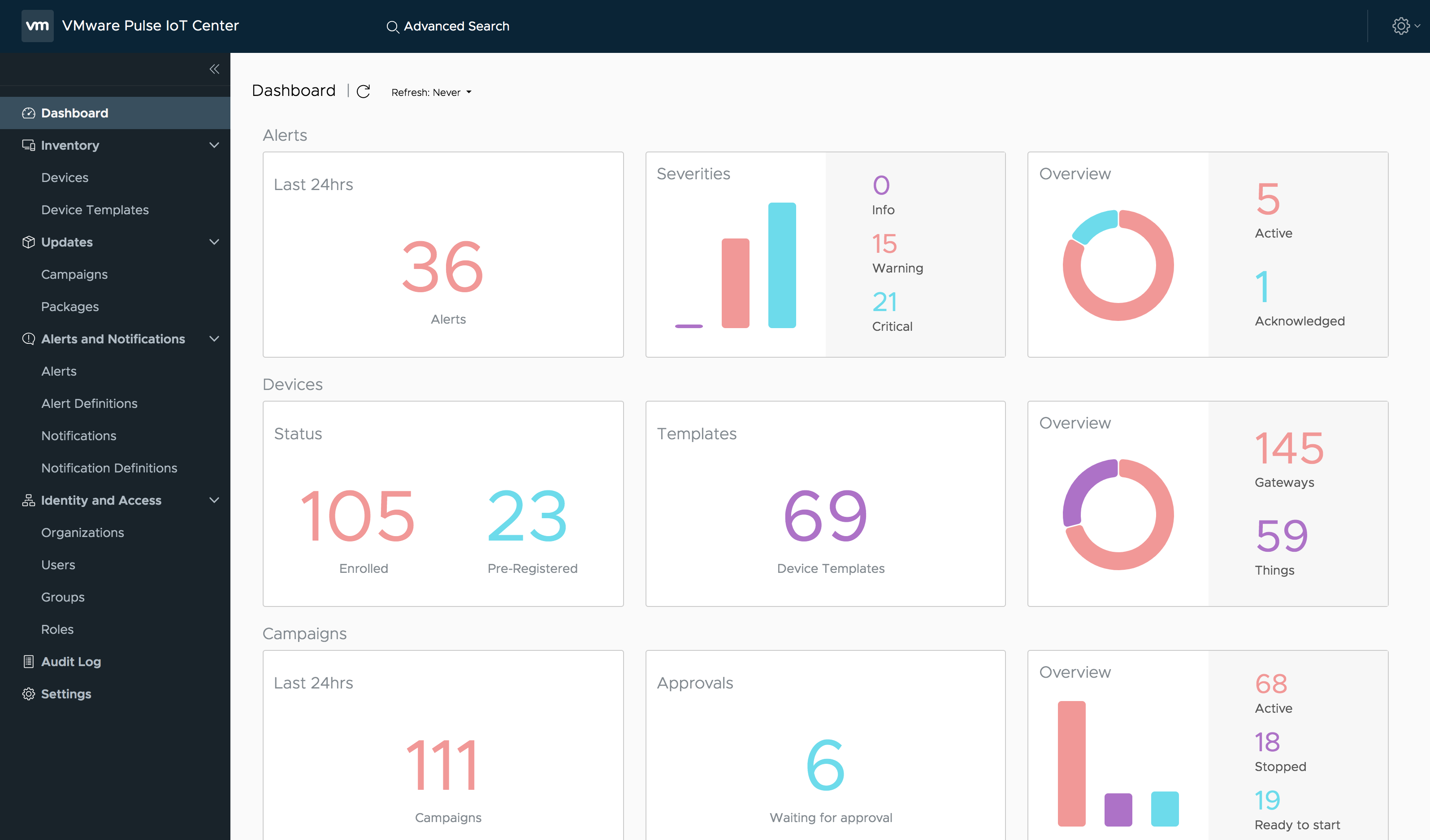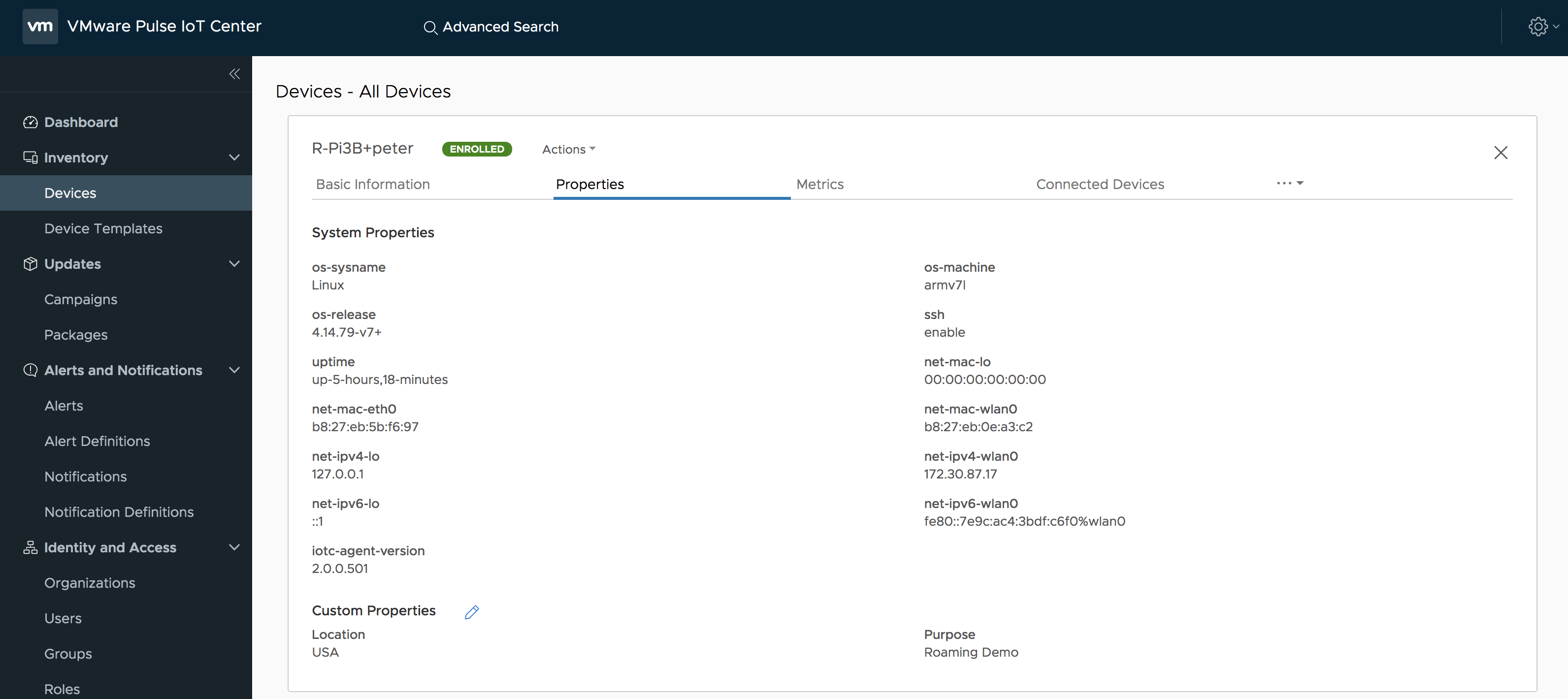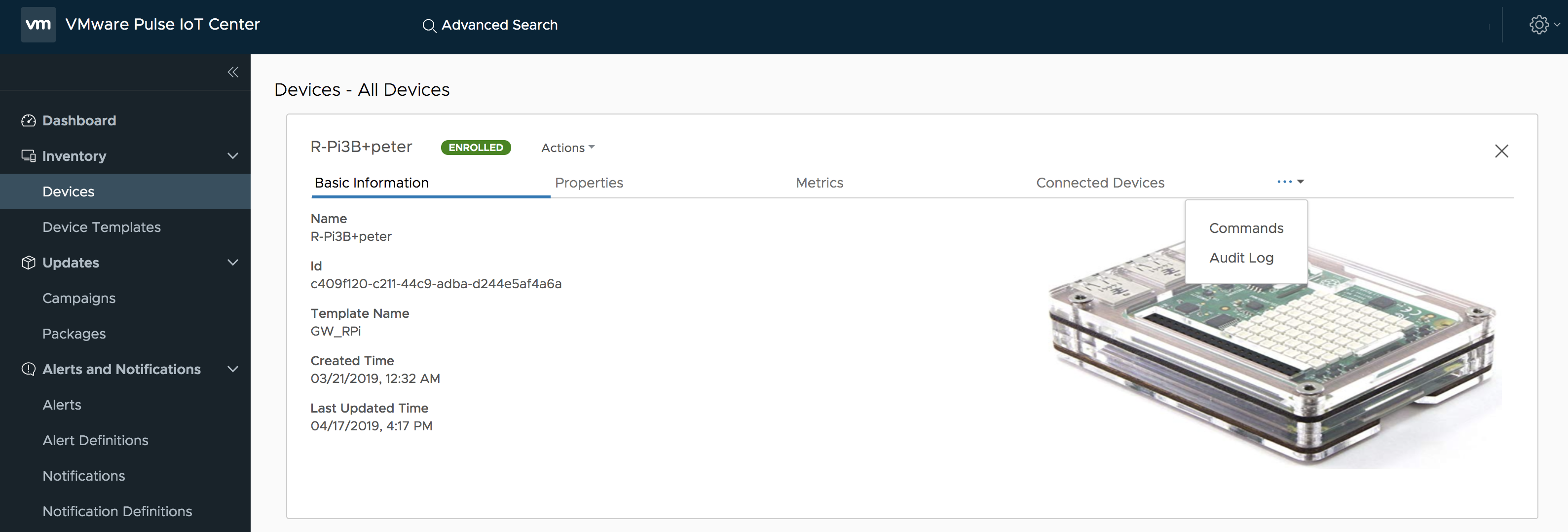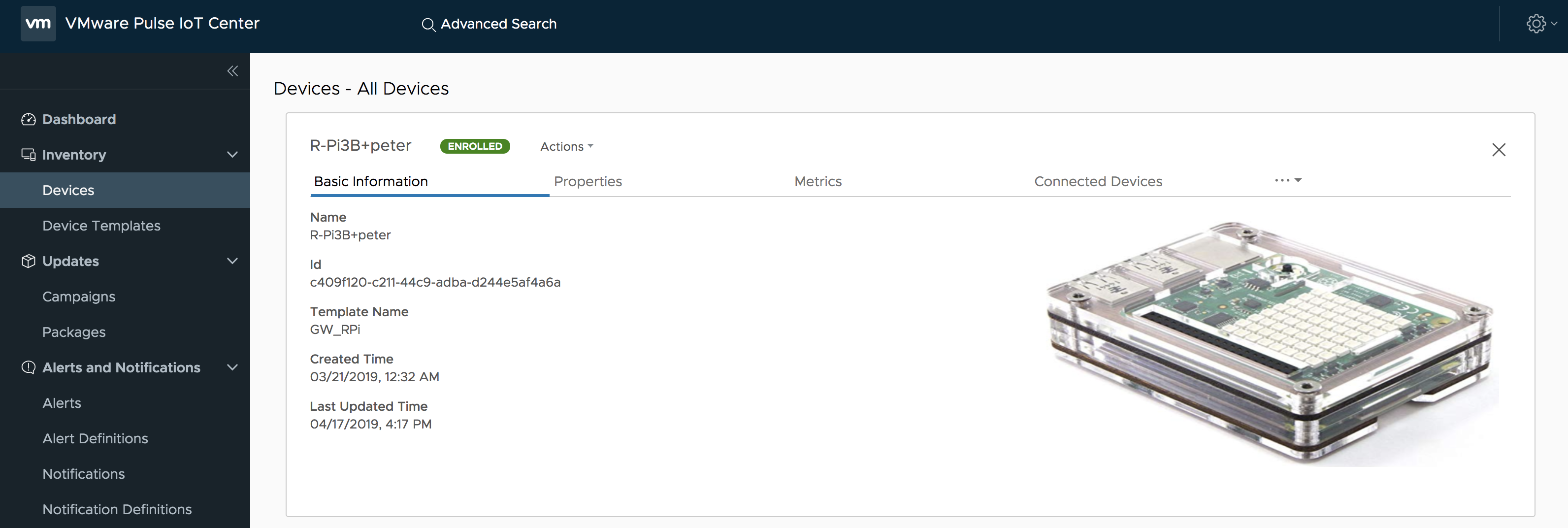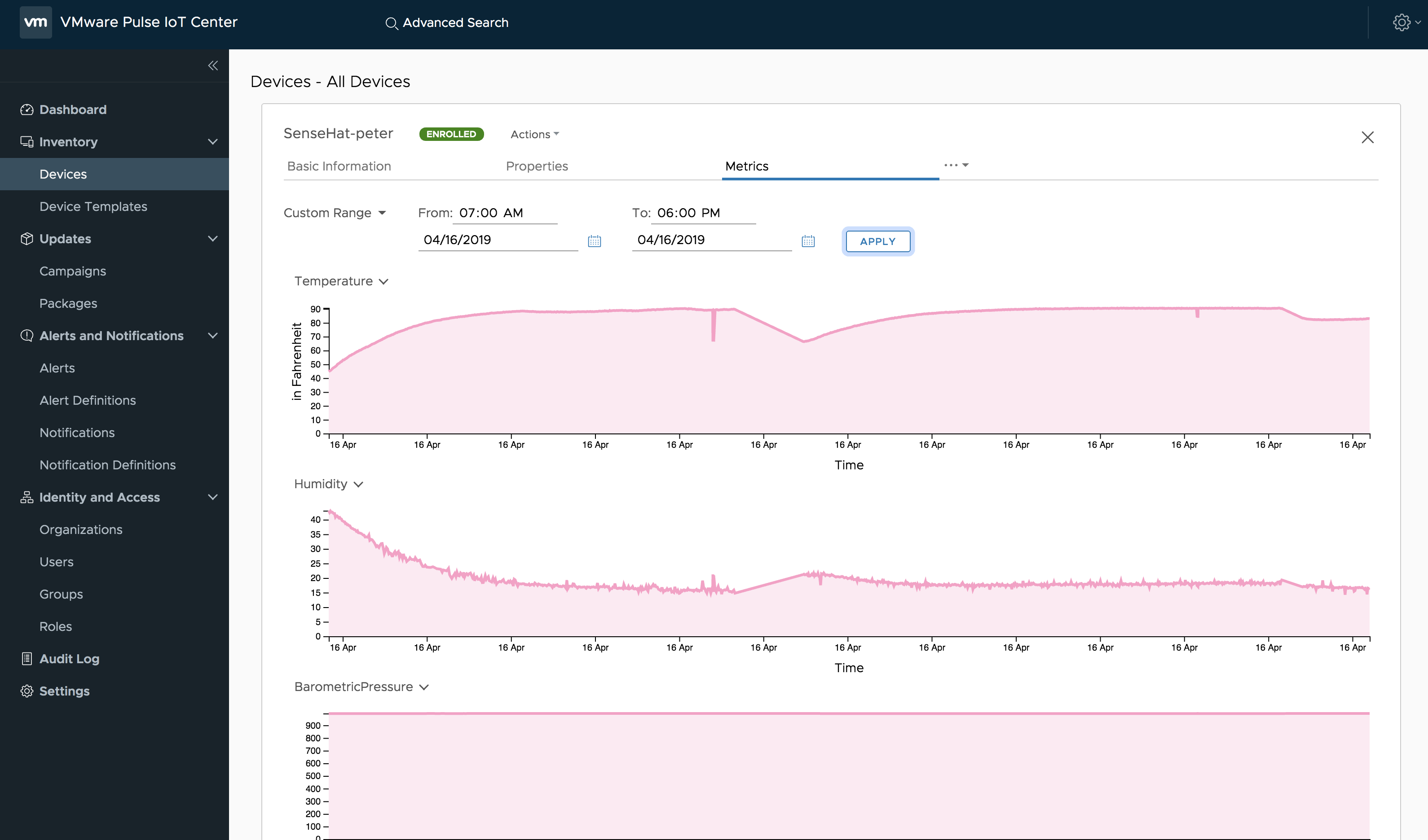 This is a Raspberry Pi 3B+ with an add-on SenseHAT that monitors temperature, humidity, barometric pressure, yaw, pitch, roll, and has a joystick and LED display. We logged into the Pulse IoT Center dashboard which is based on the standard VMware Clarity HTML5 UI. So the look and feel and navigation should be familiar to administrators of other VMware products.
