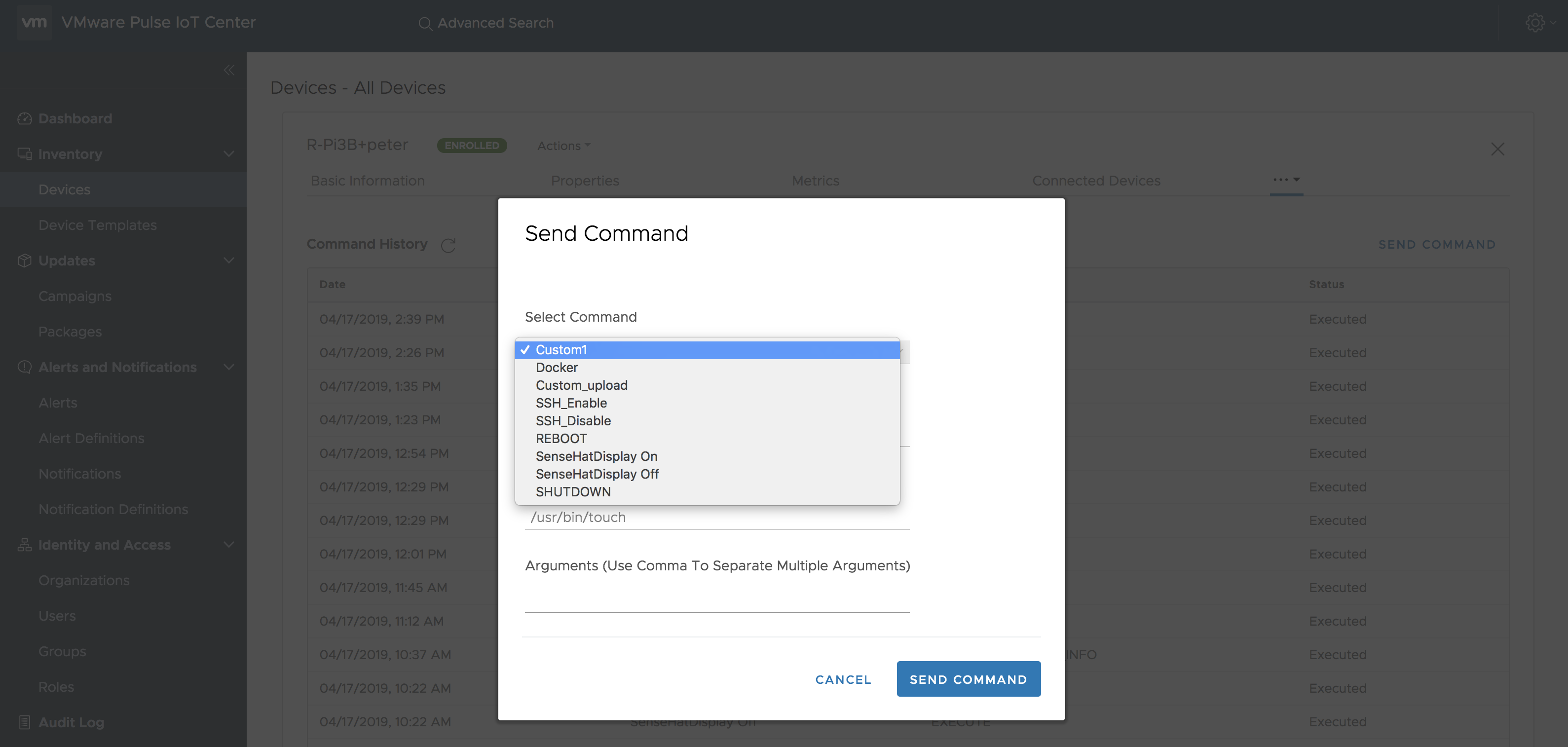 Once in the Command Console you can click on “SEND COMMAND” to get this list of predefined commands as well as some commands we added:
