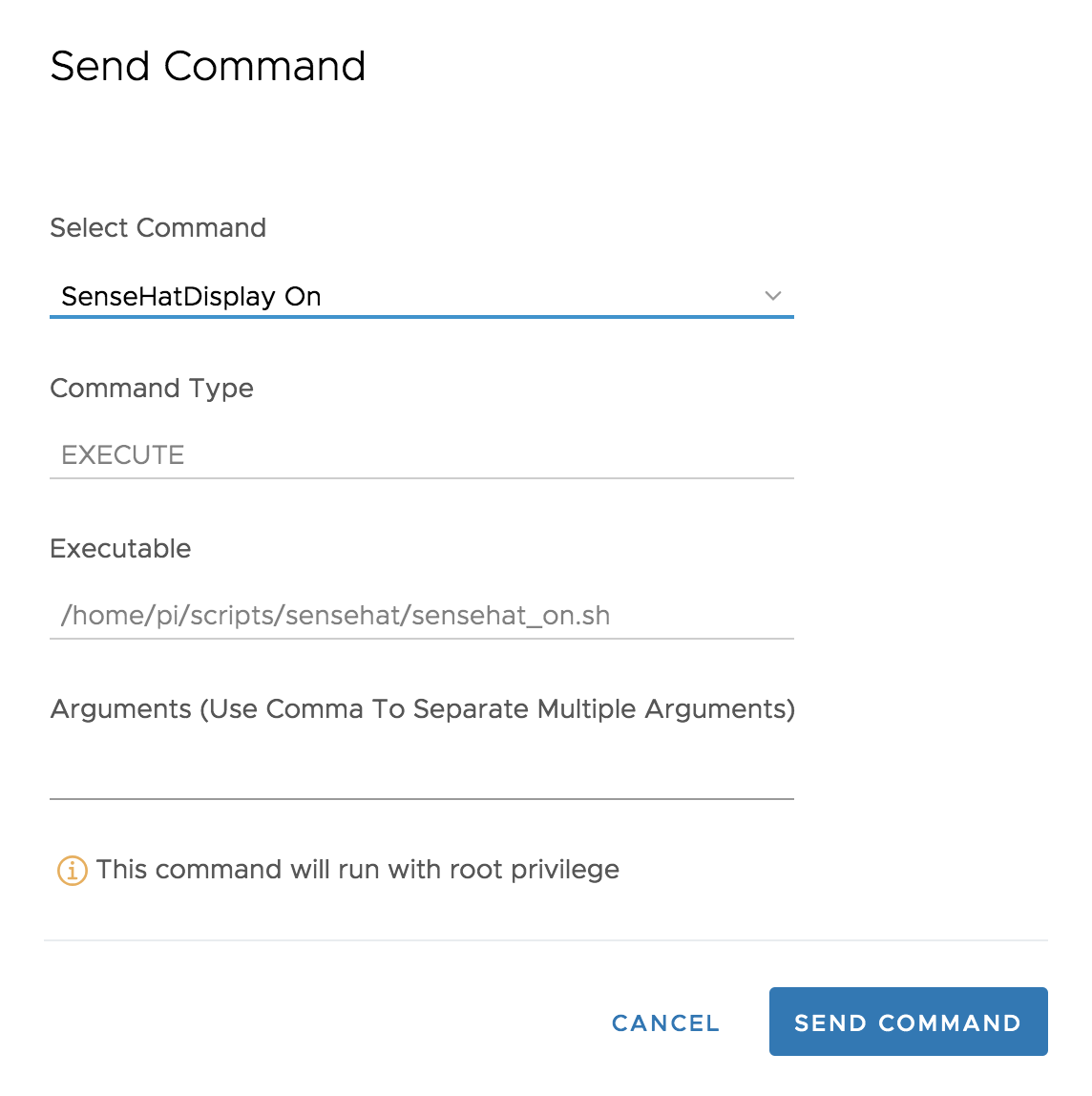 For the demo, we want to turn on the SenseHAT LED display so we select “SenseHatDisplay On” and then click “SEND COMMAND”.